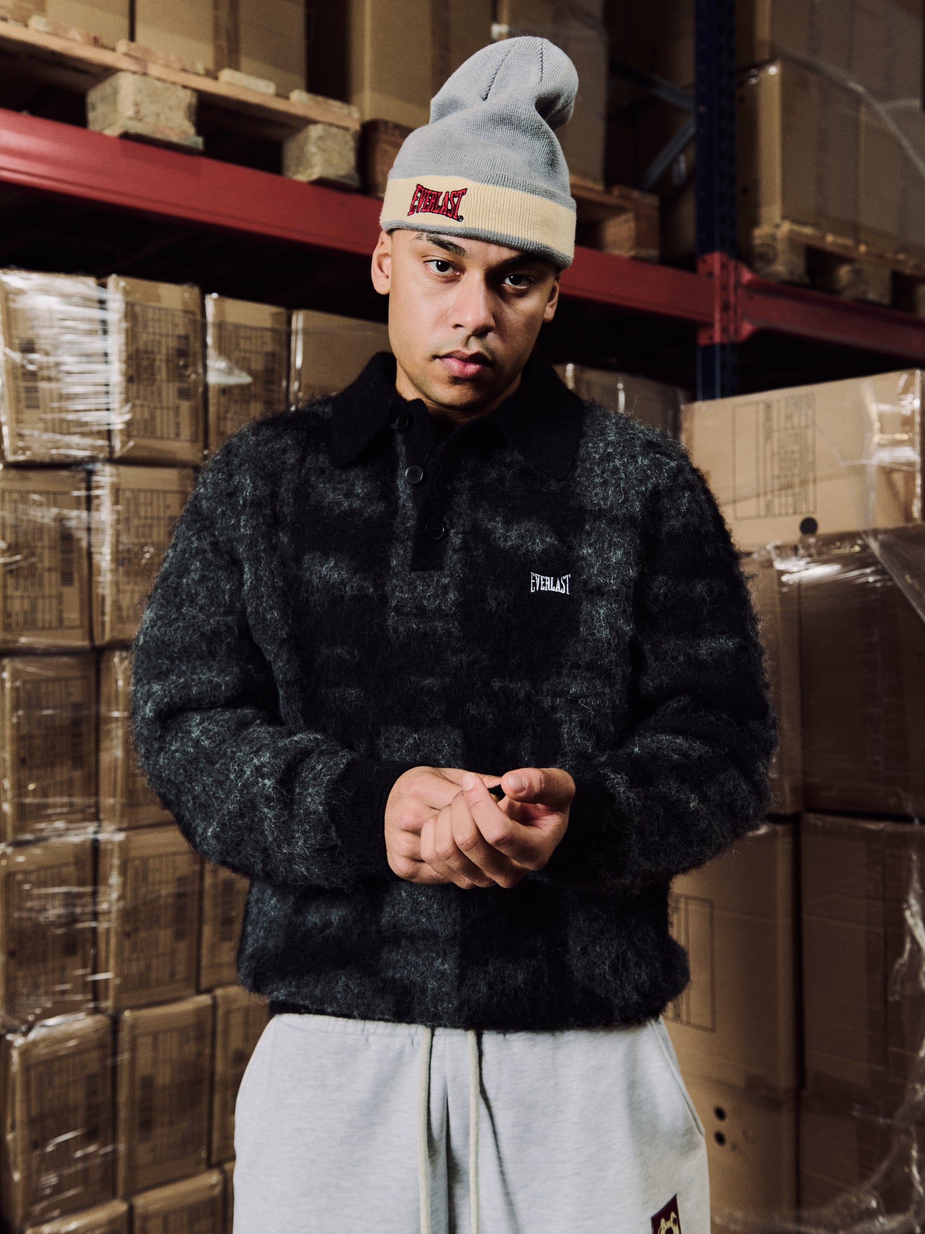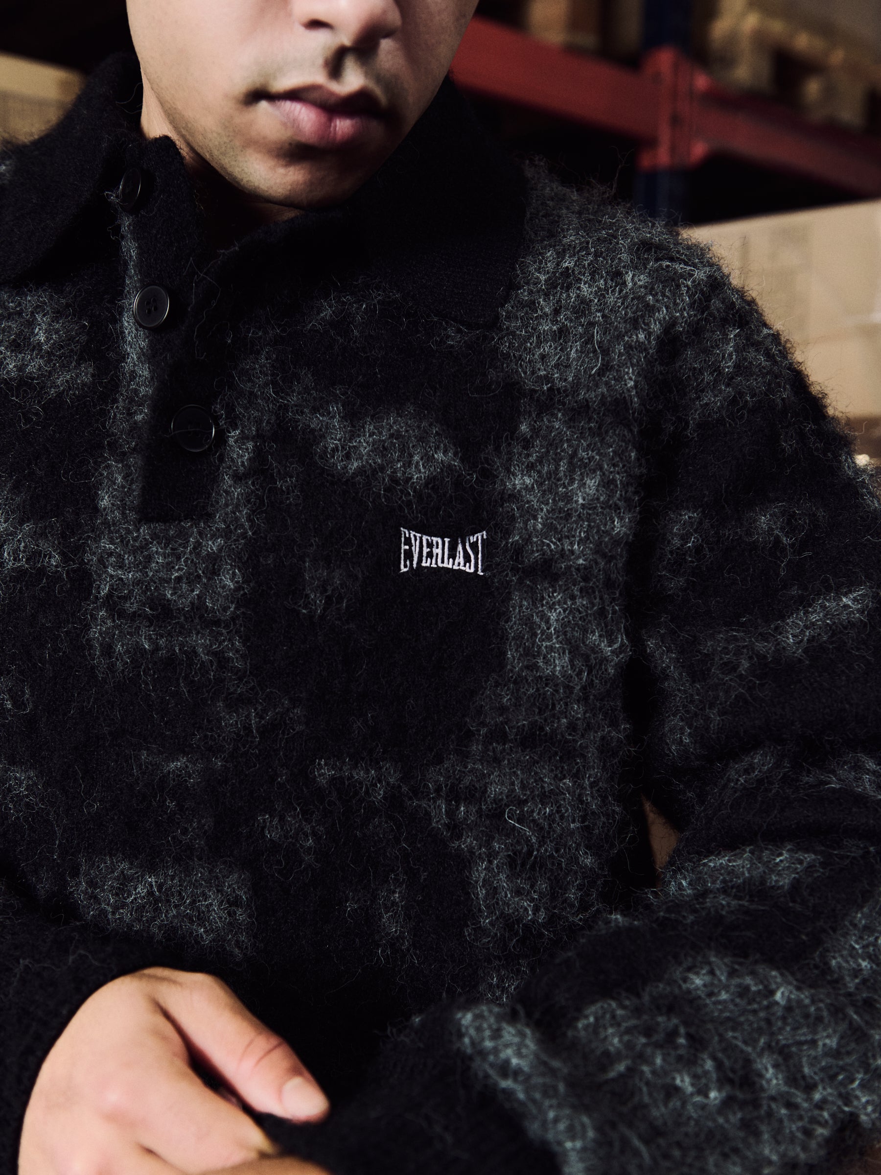• The “Lightning Knit” comes in an exclusive expression from top to bottom. Designed with a structured polo fit featuring three-button closure and premium mohair blend for a soft yet elevated finish. Grey and black tones define the design, creating a sharp look.
