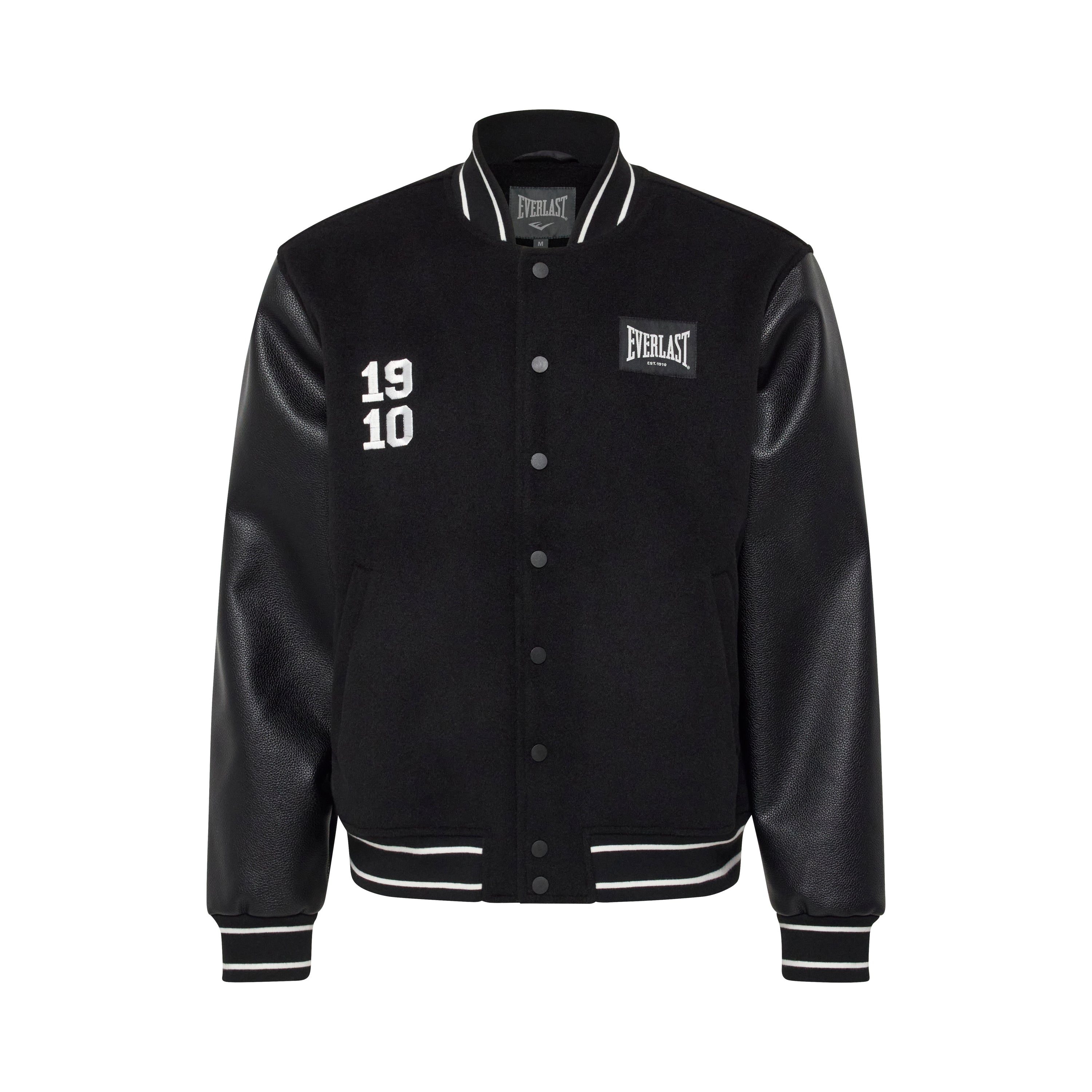 Klassisk varsity-jakke med sporty detaljer og tidløs stil. Denne jakke kombinerer uldblanding i kroppen med ærmer i imiteret læder for et autentisk look. Med trykknap-lukning, ribkanter med striber og ikoniske Everlast-logoer giver den både komfort og kant – perfekt til hverdagsbrug eller som statement-piece.