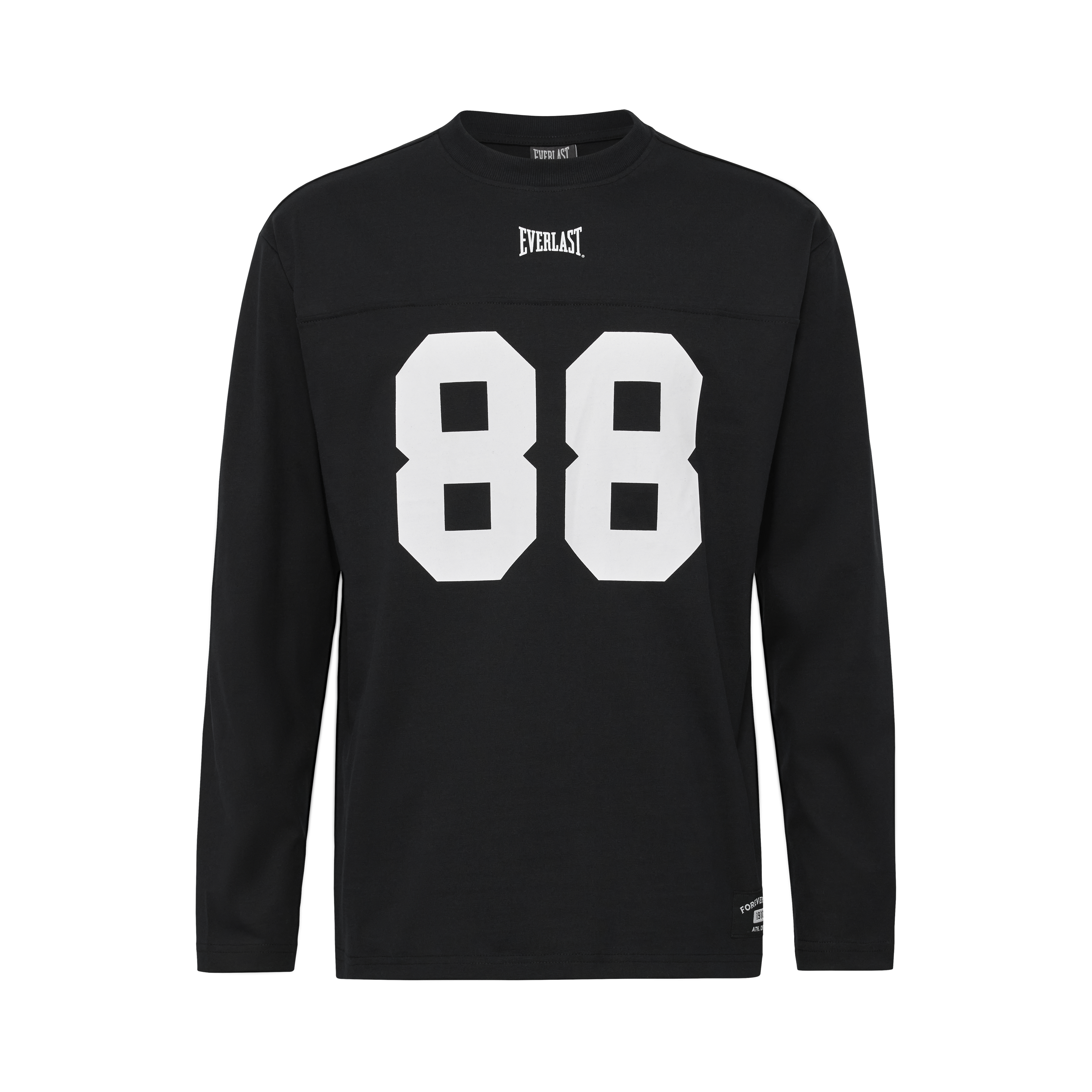 Longsleeve Tackle Jersey fra FOREVERLAST er en sort longsleeve jersey i bomuld med broderet EVERLAST logo og nummerprint på fronten. Designet har et markant sportsinspireret udtryk til hverdagsbrug.